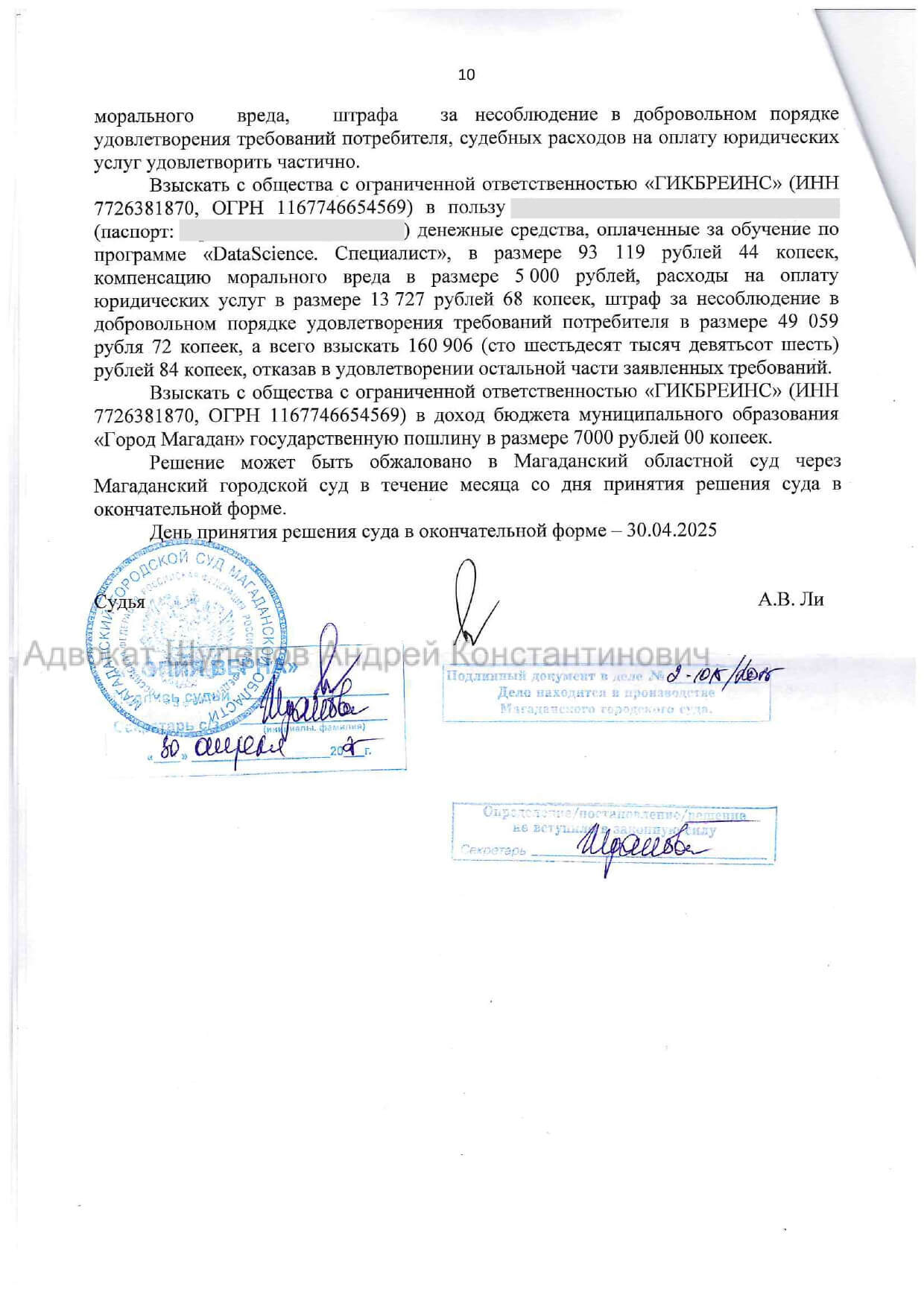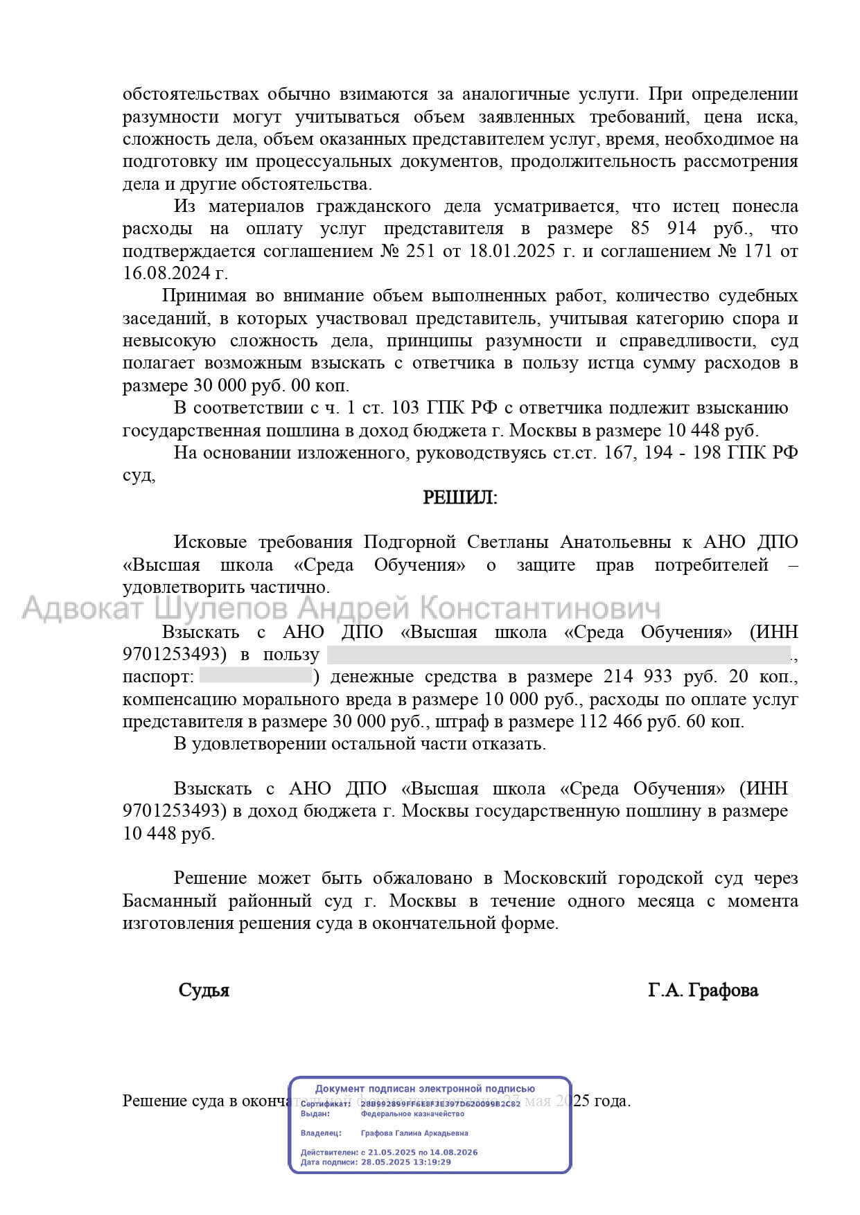 Я пыталась сама вернуть деньги курс, но мне отказали. Мне порекомендовали Андрея Константиновича. Он подготовил досудебную претензию, которую я отправила в школу. Через 1 день деньги мне вернули. Спасибо за оперативность в решении моей проблемы!